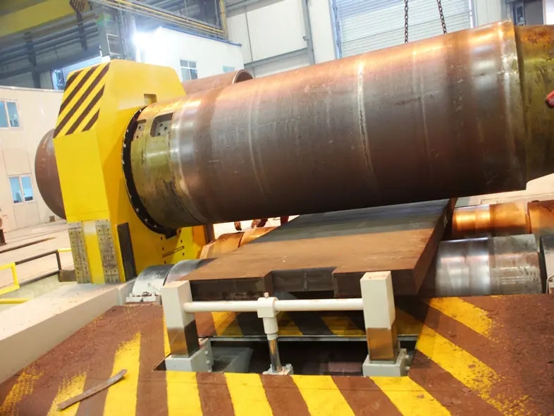 液壓全驅動水平下調式三輥卷板機,釆用右主油缸釆用上置,左主油紅下置式結構。該機三個工作棍均為主驅動輥,上輥由液壓馬達通過行星減速 機減速帶動回轉,下輥由液壓馬達通過行星減速機減速帶動回轉,行星驅動裝置與卷輾軸直接耦合,可以大幅度減少負載損失(無用功),使盡可能 大的功(有用功)用于卷板;上掘的升降采用液壓傳動,升降位移由計算機控制,自動調平,屏幕顯示,同步精度±0.2mm。下輥水平移動采用機械 傳動,水平移動通過蝸輪減速機減速,經螺桿、螺母副轉換為直線運動帶動。翻倒架的傾倒和復位采用液壓傳動上的尾部裝有液壓平衡機構,可以方便卸出卷制后的工件及筒體。設有固定式操作臺和遙控按鈕盒各一個,方便工人使用。設有安全聯鎖裝置,使操作更加安全。該機操作簡單、維 修方便,卷制精度高,是一種先進實用的大型卷板設備。