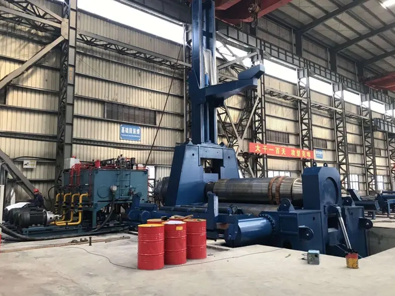 兩個下輥的水平位置可以獨立調整,水平運動采用液壓傳動,中心距離可以調整;滾動錐停止安裝在翻轉側的下輥的軸承座上,以減緩扇形板的小端,實現錐體在一定范圍內滾動;一般錐角30°,滿負荷的50%。上輥的尾部配備了平衡機構,可以輕松卸載軋制工件和氣缸。風塔折彎機配有固定控制臺和遙控按鈕盒,方便工人使用。風塔彎曲機配備了安全聯鎖裝置,使操作更安全。鋼板折彎機操作簡單,維護方便,軋制精度高,是一款先進實用的大板軋制設備。